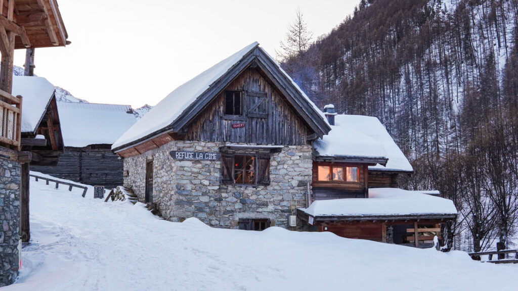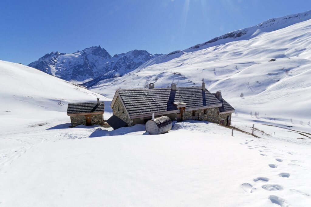 Ce refuge se trouve à 1 940 mètres d’altitude, au-dessus du village de Chazelet, face à la Meije. Idéal pour une initiation au ski de randonnée, avec des itinéraires accessibles, et bonus non négligeable : un sauna finlandais avec vue sur les sommets. Le combo parfait entre effort et réconfort.