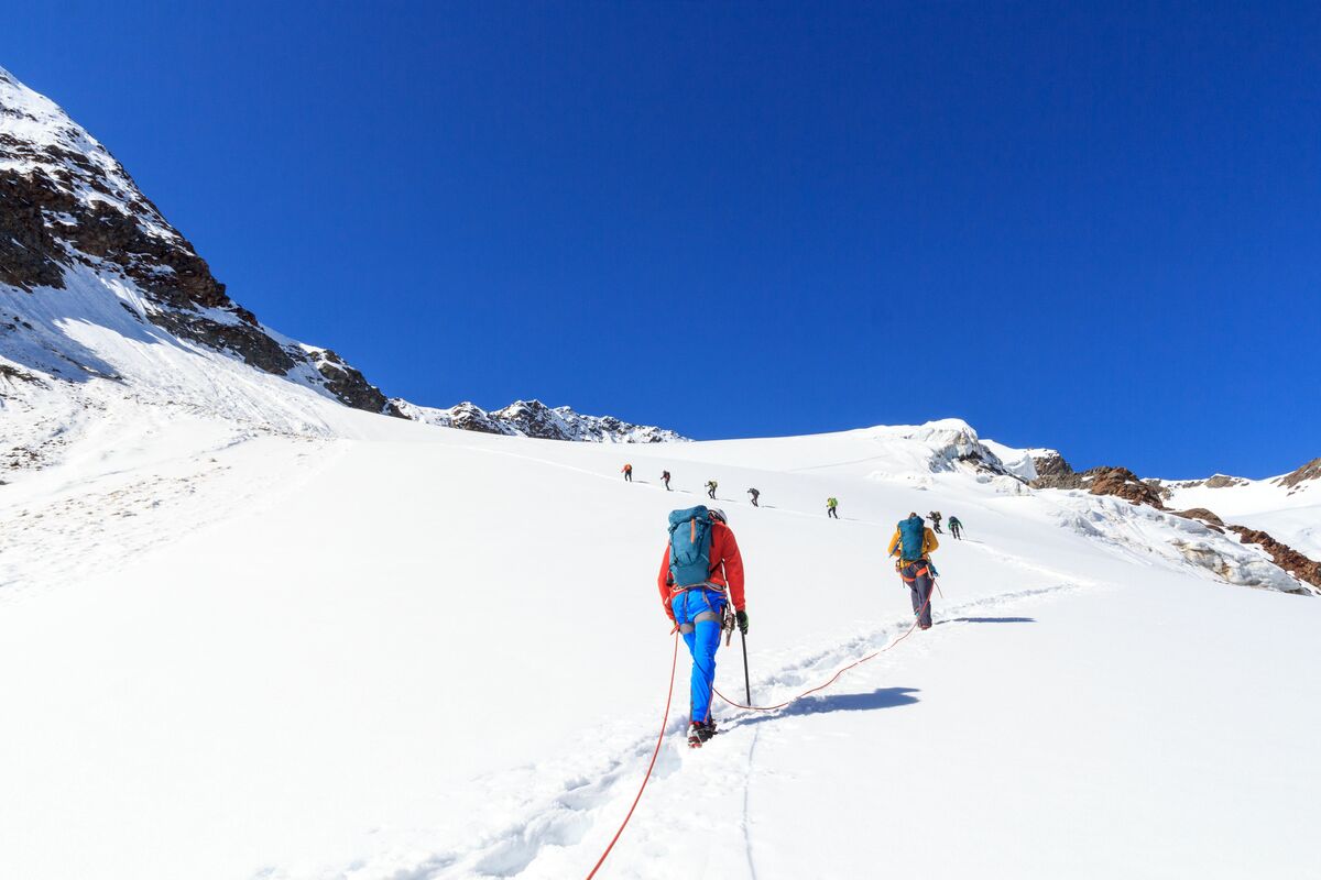 L’apprentissage et la mise en pratique des techniques de base de l’alpinisme : marche encordée, progression sur glacier, utilisation des crampons et du piolet